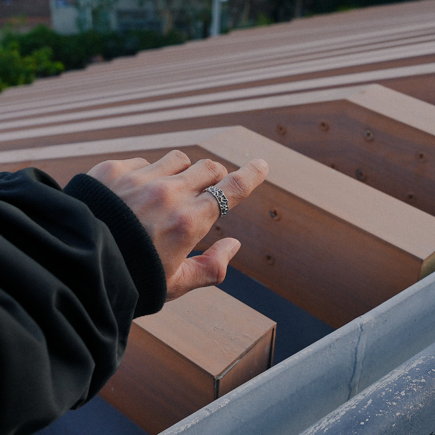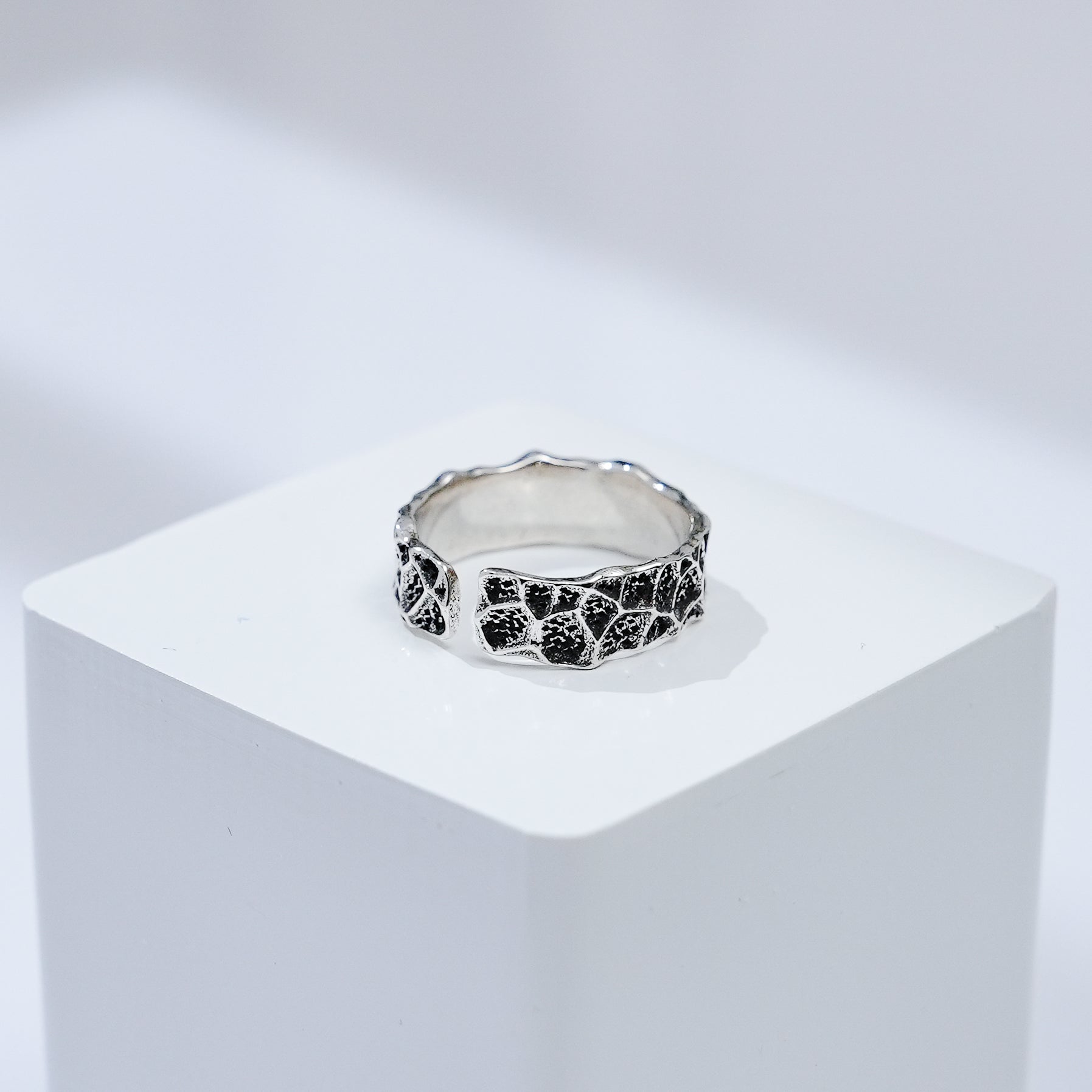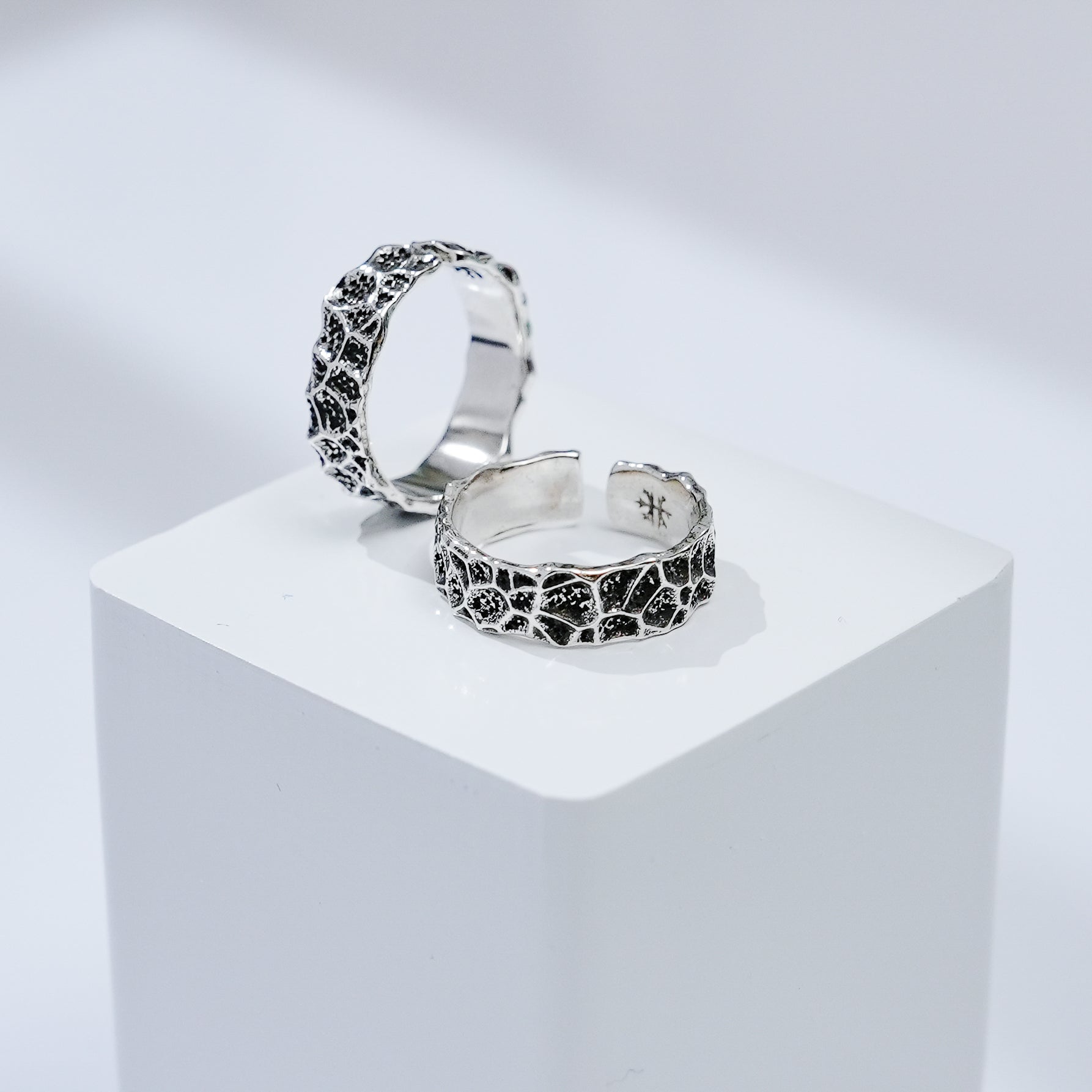 這款「錘紋」戒指採用S925純銀材質,以精緻的手工錘紋工藝打造,表面呈現凹凸不平的獨特質感,展現低調而不失個性的風格設計。